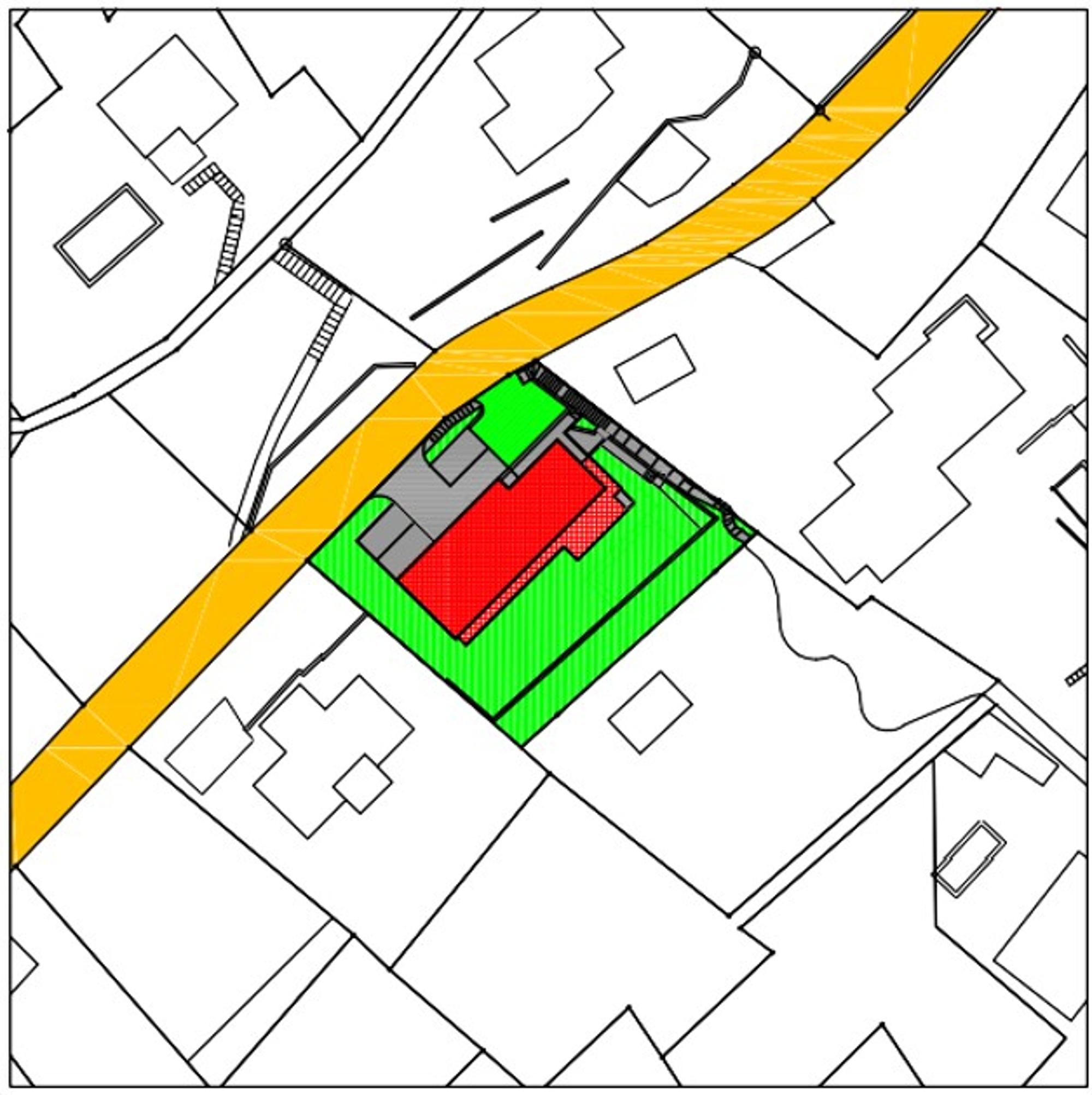 Das Grundstück hat eine Gesamtfläche von 772m2 und befindet sich im ZR-Zonengebiet in der Bauzone-ZR: